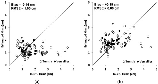 Retrieved Hrms versus measured measurements. (a) the mv used at the input of the network corresponds to mv estimated at the plot scale; (b) the mv used at the input of the network corresponds to mv estimated at the scale of the study site. For these two configurations, a priori information on mv was used for estimating mv.