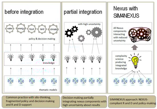 While previous efforts have considered nexus elements either in complete isolation or only in ‘partial integration’ (i.e., considering only a few nexus elements at one time), SIM4NEXUS aims to address all the water-food-land-energy-climate elements together (Figure 1) and to account for the possible impact on these elements in response to climate and relevant policy changes. SIM4NEXUS aims to address both research and knowledge gaps regarding the global nexus at multiple scales and communicating critical results to policy-makers via a state-of-the-art serious game built on robust science. Considering Figure 1, the image on the far left reflects the ‘traditional’ approach with sectoral modelling (e.g., from models such as CAPRI (Common Agricultural Policy Regionalised Impact Modelling System) or E3ME (energy-environment-economy[E3] macro-economic model)). The middle image reflects the most current advanced approaches (e.g., impact assessment tools, integrated assessment modelling, integrated water resources management). There is partial integration, e.g., linking the model MAGNET (Modular Applied GeNeral Equilibrium Tool) with IMAGE, used to assess cross-sectoral impacts of climate, social and/or policy changes, but complete nexus understanding is still missing. SIM4NEXUS integrates thematic models within a system dynamics modelling framework to integrate the knowledge and data from thematic models and local experts. SIM4NEXUS adds the learning from playing the serious game and testing nexus-compliant policies. In addressing nexus-wide interconnections, system-wide trade-offs and synergies can be sought, with benefits for multi-sectoral policy development and planning [].