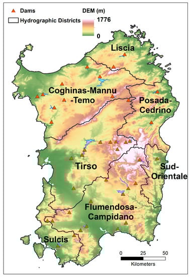 Map of Sardinia, showing the seven hydrological districts and the locations of the reservoirs studied.
