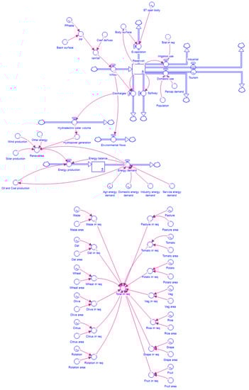 For the Sardinia case study, the main focus of the SDM was the representation of the reservoir water balance for the island, accounting predominantly for water supply and for water demand related to agricultural, energy and domestic/tourist consumption. Energy generation and consumption were also important along with the mode of generation and sector of consumption, as was modelling the change in crop types (i.e., land use and food production changes) and the crop water requirements associated with potential crop and cropped area changes, as well as in response to change in the local climate. While water is the central focus, this model is not only concerned with Sardinian hydrology and is not a hydrological model, but considers other nexus sectors including energy, climate, food and land use.
