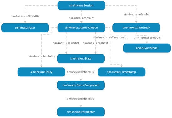 The ontology (Figure 5) represents the SIM4NEXUS knowledge and scope. Currently, the top concept is the ‘Session’, which represents a game session in the serious game front-end. Linked to the ‘Session’ there is a ‘User’, representing the player, and a ‘Case Study’ (at the moment this is only Sardinia), which in turn is related to a specific ‘Model’ (currently the SDM for the Sardinia case). In order to represent the nexus state through the game, the ‘Session’ has a list of ‘StateEvolution’, which represents the changes from one state (‘State’) to the new state (‘State’), after the user decides to apply certain polices (‘Policy’). The ‘State’ is defined by a collection of ‘NexusComponent’ (for instance, ‘Climate and environment’ or ‘Water’), and these components have specific related variables (‘Parameter’).