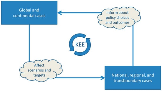 The feedback between spatial scales is facilitated by the KEE. The KEE collects data about players’ policy choices and the resulting consequences for the nexus components. This mechanism will be used to feed new targets resulting from games at the global or continental scale, into games at the national or regional scale. For instance, some policy may result from playing a game on the European level. This policy may entail new targets set at national and regional levels. By playing games with these new targets with national and regional policy makers, data can be collected about their reactions and the consequences for the nexus components. The KEE will then inform the policy makers at the European level (Figure 7).