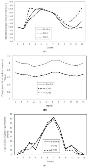 (a) Showing the results of the Sardinia fast-track simulation for the baseline (2010) and for 2030 under RCP4.5 and 8.5. Results show the total water stored in all Sardinian reservoirs. (b) Energy generation and consumption for the baseline and both RCP scenarios. Energy generation equals consumption in each month. The predicted generation/consumption in the RCPs are the same. (c) Irrigation crop water requirements.