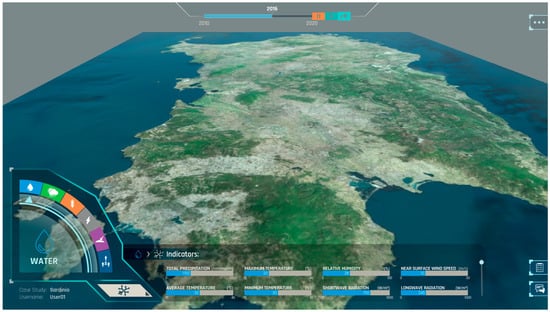 The SIM4NEXUS development of the serious game front-end for each case study uses the AquaRepublica serious game developed by DHI [] as a starting concept, but further develops that game for the specific requirements of each case study in SIM4NEXUS. The goal of the game is to bridge the gap between science and policy stakeholders by translating complex modelling results into an interactive virtual world. The serious game will be used in stakeholder workshops to explain and provide learning opportunities about the potential impact of different policies on the nexus and how these policies impact a case study through a “learning by playing” approach (Figure 6).