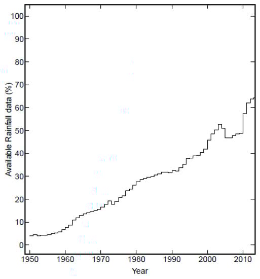 Climate records are used for a wide variety of purposes, ranging from the characterization of climatic types of a particular location, to running operational models for resource evaluation and exploitation []. Climate data are also relevant for agricultural and ecological research [,], becoming critical inputs to forecast crop growth and development rates, as well as to model population dynamics of pest and diseases []. In addition, the data represent a baseline to assess global and local climate change effects []. However, climate information is not always available with the required spatial resolution and temporal coverage. Such lack of information becomes worse as one tries to retrieve information from the past. As an example, only 65% of the daily precipitation data in Chile can be retrieved for 2013, whereas less than 5% of daily rainfall data from 1950 is available (Figure 1). Thus, obtaining a complete and reliable long-term historical climate series is typically a challenge.