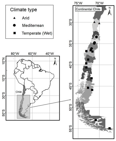 - Sánchez, A.; Morales, R. Las Regiones de Chile: Espacio Físico y Humano-Económico; Editorial Universitaria: Santiago, Chile, 1993. [Google Scholar]