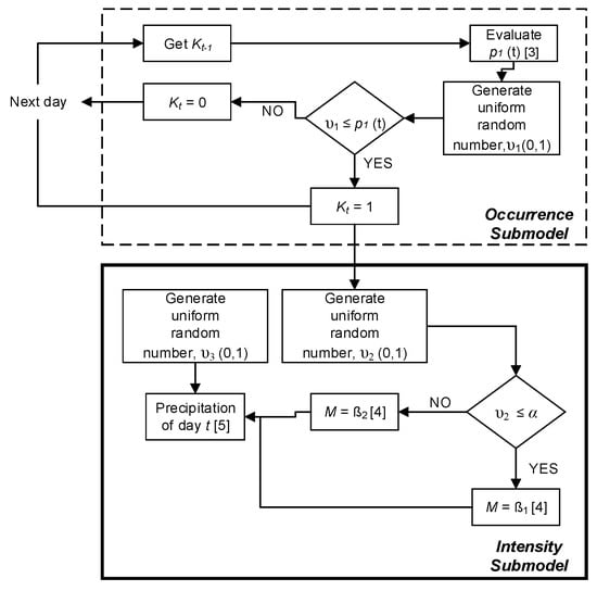 Given the strong seasonality of the precipitation regime, the parameters of the model used to estimate were fitted individually to each month, using the maximum likelihood approach with a numerical optimization procedure. The same approach has been followed by other authors (see as examples Furrer and Katz [] and Wilks []).To determine whether precipitation occurs in the simulated day, a uniform random number (υ1) is generated. If ≤ υ1 a rainfall event is simulated, otherwise the day is considered to be dry (Figure 3).