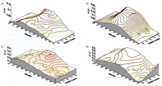 This study shows that incorporating the ENSO index as a covariable in a GLM scheme improves the representation of the precipitation occurrence process (i.e., it allows a better estimation of transition probabilities) in the arid and Mediterranean zones of Chile. This situation was introduced by Furrer and Katz [,] for an Argentinean area, located at a latitude similar that to Santiago. In addition, Montecinos and Aceituno [] indicate that during episodes of El Niño there is a tendency to increase the average precipitation during winter, between 30° and 35° S, and during late spring, between 35° and 38° S (Mediterranean), mostly because of an increase in the frequency of rainy days rather than an increase in the daily magnitude. On the other hand, the ENSO index does not significantly contribute to the estimation of precipitation occurrence in the temperate regions of Chile (i.e., Valdivia and Puerto Aysén). We found that the ENSO index produces the same effect of on both and : higher positive ENSO index values induce a greater probability of rainfall, irrespective of whether the previous day was wet or dry. Hence, the model is able to increase the frequency of rain during an El Niño phase, and decrease it during La Niña events.
