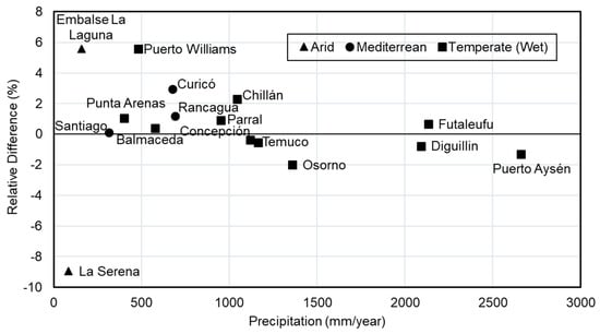 The model is now evaluated in terms of its capability to reproduce annual precipitation. Figure 5 shows the relative difference (%) between observed and synthetically simulated average values of this variable. This difference varies among the climates, and tends to be larger for the gauges located in arid regions. In fact, there is an error of ~9% for La Serena gauge (i.e., the observed and simulated annual average are 84.3 and 76.8 mm respectively). Overall, larger errors in arid regions with long dry periods are partially explained by the larger number of zero precipitation days through the year, which affects the estimation of the model’s parameters. Nevertheless, annual precipitation totals and standard deviations for all of the Chilean stations are simulated reasonably well, as illustrated in Figure 6.
