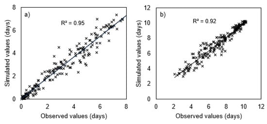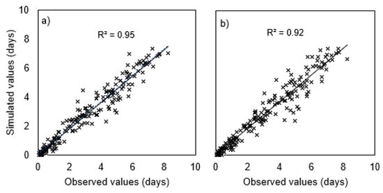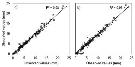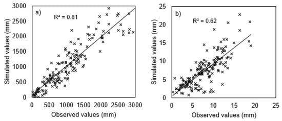 Our results are in agreement with the findings of Breinl et al. [] who used a semi-parametric WG, and demonstrated that simulations are less biased in wet temperate climates than in dry climates. Nevertheless, the error in the estimation of average annual precipitation in the arid regions of Chile associated with the model proposed (i.e., 8.94%) is much less than that obtained by Taulis and Milke [], who overestimated the average annual precipitation in the same region by 42% when using gamma distribution for daily precipitation (WGEN). Also, our results confirm the arguments of Li et al. [], who suggested that functions with more parameters improve the estimates of daily rainfall. In particular, using the mixed exponential distribution allows for a better reproduction the interannual variability []. Nevertheless, caution must be taken when using more parameters, in order to avoid the potential issue of overfitting, which can limit the applicability to additional data.