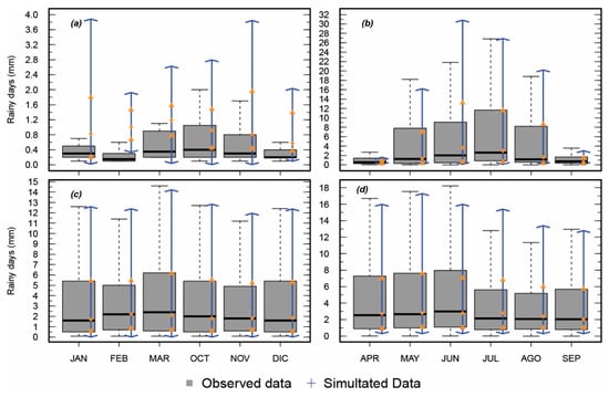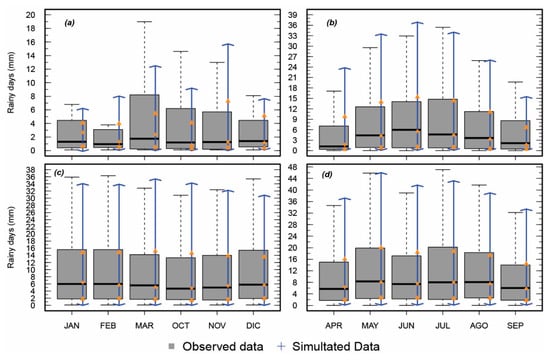 Box plot of rainy days calculated from observed and simulated data, grouped in spring–summer months (Left) and autumn-winter months (Right) for La Serena (a,b) and Balmaceda (c,d). In each box plot, the upper triangle, rhombus and lower triangle denote quartile one (Q1), quartile two (Q2) and quartile three (Q3). Five hundred simulations of 64 years were produced to generate the box plots for the simulated data.