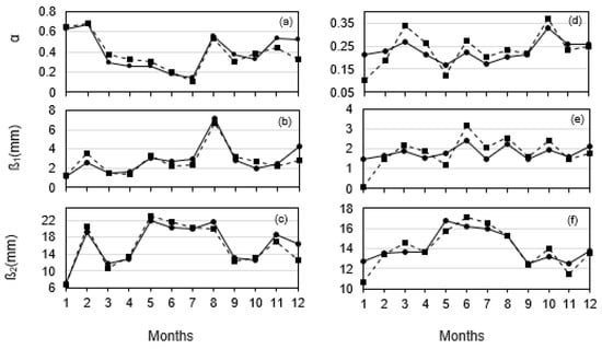 Seasonal variation of the parameters of the mixed exponential distribution from synthetically generated (dotted lines) and historical data (lines); (a–c) Rancagua gauge (Mediterranean climate); (d–f) Puerto Aysén gauge (temperate climate).