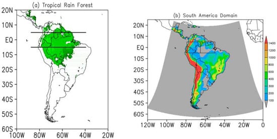 (a) Green areas represent the plant functional type of tropical rain forest that was replaced by C3 grass in the LUC simulation and the two horizontal black lines represent the cross section (5° S–5° N) selected for deeper analysis; (b) South America simulation domain and topography (m). Rectangles in (b) indicate the western (left) and eastern (right) sides of the AMZ.