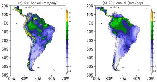The first part of the results presents the validation of the CTRL experiment (air temperature and precipitation) by comparing it with the monthly observed data from the Climate Research Unit (CRU, []). The air temperature and precipitation from the CRU were obtained using only observed data from surface stations over land, at 0.5° × 0.5° horizontal resolution. The precipitation and temperature change signals due to AMZ deforestation were evaluated by comparing the climatology (1980–2009) of the LUC and CTRL.