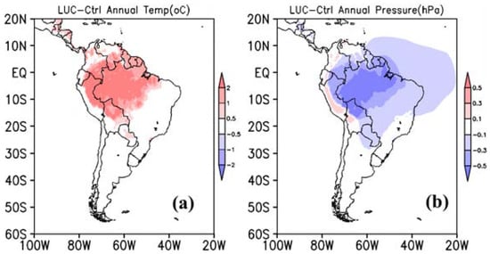 In this section, a comparison is presented between the experiments replacing the tropical rain forest with C3 grass over the Amazon region. The LUC experiment presents higher annual mean air temperature over north-west SA (Figure 3a). Warming at low levels of the atmosphere contributes to decreasing the surface pressure and, as a consequence, it develops a thermal low (Figure 3b). This signal was also found by other deforestation studies over the AMZ, such as [,].