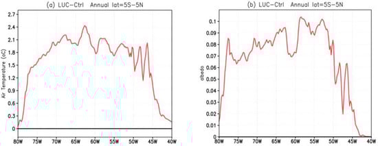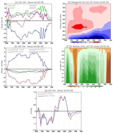 Air temperature and albedo (Figure 4a,b) increased, respectively, until 2.5 °C and 0.1 (~10%) over the deforested area as shown by the cross section in Figure 1a. The albedo increased because the tropical forest was replaced by C3 grass, and it is more accentuated between 60° and 50° W. In previous works, Culf, A.D. et al. [] and Eltahir, E.A.B. [] also showed that deforested areas have higher albedo than forests. Moreover, Eltahir, E.A.B. [] mentioned that the surface net radiation (Rn) over cleared areas is smaller than over areas with no deforestation. Figure 4c presents lower Rn (red line) in LUC than in CTRL in the western sector of the AMZ basin, which may indicate an increase in low cloud cover that reduces the incoming solar radiation at the surface.