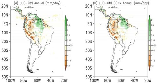 On the other hand, over the eastern AMZ there was an increase in moisture flux convergence in the LUC (1.10 mm day−1) compared to the CTRL, which was higher than the reduction in evapotranspiration (0.60 mm day−1). This excess of 0.5 mm day−1 of moisture in LUC may justify the larger rate of precipitation in the eastern AMZ. The latter result is driven by the convergence of moisture flux related to the intensification of winds at low levels (Figure 6a) transporting moisture from the tropical Atlantic Ocean to the continent.