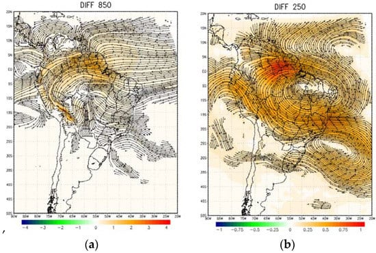 Changes in land use (from forest to grass) reduce surface roughness and increase the thermal gradient between the tropical Atlantic Ocean and the continent, with a consequent intensification of winds at low levels (850 hPa), mainly on the eastern AMZ (Figure 6a). Southward of 20o, the eastern Andes low level jet is weakened, which may reduce the moisture flux transport from the north to southeastern SA. Above the low levels at the thermal low (Figure 3b), there is an anticyclonic anomaly in 250 hPa (Figure 6b).
