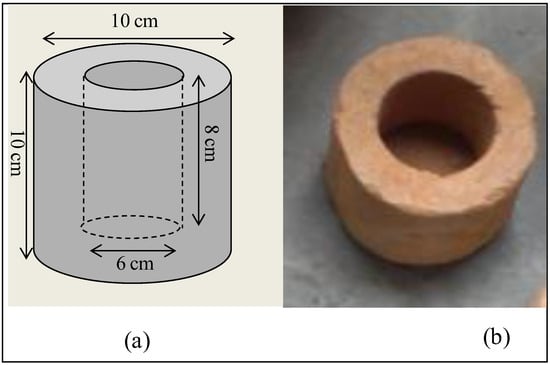 A cylindrical shaped ceramic filter was made using locally available clay soil and rice bran in Bangladesh. The clay soil is also easily available in the KSA. However, saw dust can be used as a replacement of rice bran in the KSA. The manufacturing process of the ceramic filter used in this study was adapted from our previous study []. The clay soil sample was dried, ground with a hammer, and sieved through a 0.5-mm sieve. The rice bran was dried and sieved through a 1 mm sieve. Sieved soil and rice bran were then mixed at a ratio of 80:20 (by weight) followed by making dough by adding water. The dough was then casted in a cylindrical-shaped mold to make the filter. The resulting ceramic filters were cylindrical in shape and hollow with one side open and had a height of 10 cm and a thickness of 2 cm (Figure 1a). Finally, the filter was sun dried for 48–72 h followed by firing in a muffle furnace in a small-scale pottery kiln at 900 °C for 4–5 h (Figure 1b). The pore size of the filter was measured to be 1–5 µm. The pore size of the filter was estimated by comparing the particle size distribution of turbid water (water with clay mixture) before and after the filtration with the ceramic filter. Manufacturing cost was estimated to be $0.2–0.3 US with an active filter area of 0.039 m2 per filter [].
