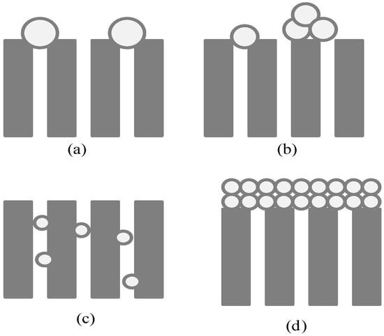 Schematic representation of different pore fouling mechanisms considered by the Hermia’s model: (a) complete pore blocking; (b) intermediate pore blocking; (c) standard pore blocking, and (d) cake layer formation.
