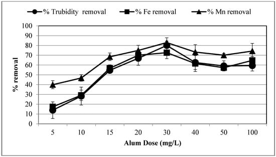 Variation of percent removal of turbidity, total Fe, and total Mn with alum doses. Raw water: turbidity = 1250 NTU, total Fe = 102 mg/L, and total Mn = 12.7 mg/L. Error bar shows the standard deviation of triplicate experiments.