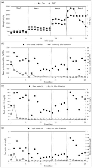 Continuous filtration experiments of 4 runs at different TMP: (a) variation of flux with TMP; (b) Turbidity in feed water and in thepermeate; (c) Fe in feed water and in the permeate, and (d) Mn in feed water and in the permeate.