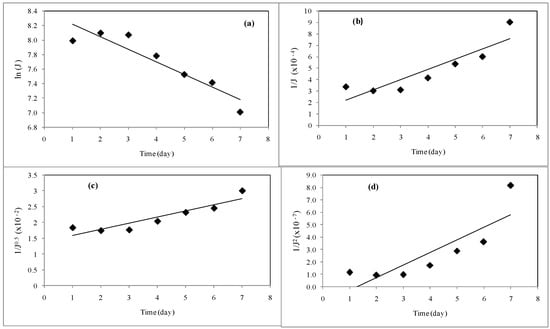 Linear plot of flux vs. time for different pore blocking models at 4.5 kPa: (a) complete pore blocking model (ln(J) vs. t) ; (b) intermediate pore blocking model (1/J vs. t); (c) standard pore blocking model (1/J0.5 vs. t), and (d) cake layer formation model (1/J2 vs. t) as given in.