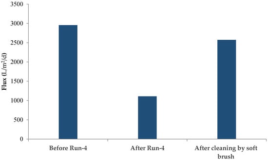 Recovery of pure water filtration flux by simple washing using soft brush in Run-4 at 4.5 kPa.