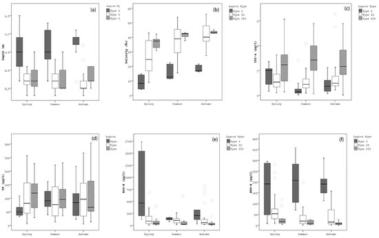 The analysis of variance showed significant variations of environmental parameters, both on seasonal and annual scale, in the three studied lagoon types of Western Greece (Table 1). Water temperature in coastal lagoon types did not show significant differences and followed the typical pattern which is generally characterized by highest values during the dry period (summer). Water depth played an important role not only to the classification of lagoon types [10] but also to the variability of nutrient concentrations. The higher mean depth value was found in lagoon Type I (1.06 m) where the predominant forms of nitrogen were NO3-N and NH4-N. During the wet period (spring) they accounted for 396 μg/L and 186 μg/L, respectively, showing significant difference among all lagoon types (Figure 2; Table 1). During the monitoring period the higher concentration of TP was measured in lagoon Type II (156.1 μg/L) in autumn (Figure 2). The concentration of TP showed significant variations between seasons and years (Table 1).