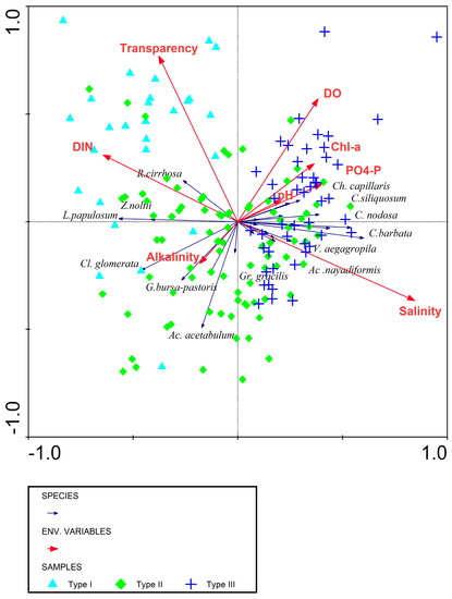 The first two axes of the redundancy analysis accounted for 81% of the total variance (Table S3). Axis 1 (66.9%) explained the higher percentage of the total variance, while axis 2 explained the 14.08%. The ordination diagram of the redundancy analysis (RDA) (Figure 6) with environmental parameters and macrophyte species shows the distribution of macrophyte species and the position of coastal lagoon types in an approximate way. The first axis is highly positively correlated with salinity and DIN concentration, while axis 2 is highly positively correlated with DO, transparency and Chl-a. Following the RDA analysis, the clustering allows the classification of the macrophyte species into lagoon types according to physical and chemical parameters. Thus, sampling stations of lagoon Type I are positioned to the upper left section of the plot, the samplings of lagoon Type II are mainly dispersed in the bottom part, while samplings of lagoon Type III are clustered to the right section of the plot. The angiosperm species Z. noltii, R. cirrhosa and the charophyte L. papulosum, positioned to the upper left part of axis 1, have a relatively large distribution span in waters with medium salinity, high transparency and high concentrations of total inorganic nitrogen as mainly found in lagoon Type I. Species located at the right part of Axis 1 are mainly found in poly to euhaline waters. The angiosperm species C. nodosa, as well as the macrophyte species C. siliquosum, C. capillaris, A. nayadiformis and C. barbata are typical of coastal lagoons classified in Type III. In the center of the diagram, along axis 1, the macrophyte species Gr. bursa-pastoris, Ac. acetabulum and R. cirrhosa, which belongs to lagoon Type II, show their preference to high salinity, lower nutrients concentrations and high marine water exchanges. The second axis reflected the gradient of photosynthetic activity with taxa located to the lower part showing higher adaptability to lower transparency, DO and Chl-a waters. Macrophyte species positioned in the upper part of the diagram were mainly present in sampling stations with high transparency and higher Chl-a, DO and PO4-P concentrations.