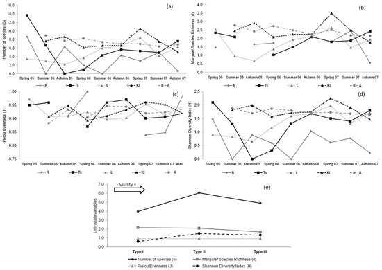 The list of diversity indices applied to each lagoon type during the study period point out significant differences on seasonal and annual scale (Figure 7a–e). Coastal lagoons of Type II (Tsoukalio and Kleisova) and Type III (Araxos) showed highest Shannon and species richness values. For example Kleisova and Araxos showed the higher species richness in spring 2007 (3.5) and summer 2005 (2.8), respectively. Figure 7e shows the clear relationship of salinity with univariate variables. Thus, coastal lagoons with higher salinity and higher seawater exchange have higher values of diversity indices. Lower Shannon values were found in the highly confined lagoon (Rodia), which is more influenced by freshwater inputs.