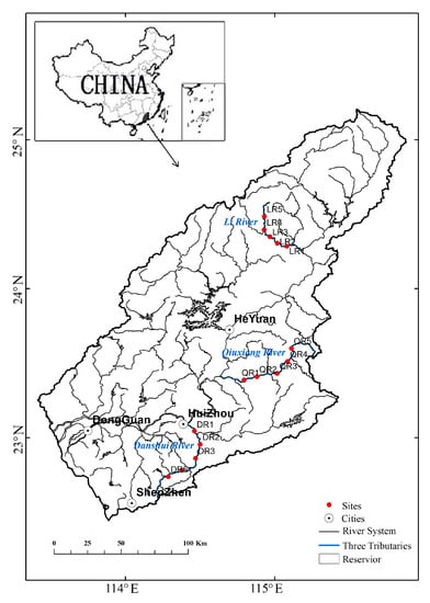 The Dongjiang River (22Β°21β²β25Β°12β² N, 113Β°04β²β115Β°50β² E) is one of the main tributaries of the Pearl River in southeastern China (Figure 1). It originates from the Xunwu country in Jiangxi Province and flows into the Pearl River at Humen Town in Guangdong Province. The Dongjiang River basin has a subtropical monsoon climate, with an annual average temperature of 21 Β°C and a mean annual precipitation of approximately 1800 mm [22]. Although there are several large reservoirs in the basin, the hydrology and water availability of the basin still demonstrate strong seasonal variations [23]. The Li River, Qiuxiang River and Danshui River are three tributaries of the Dongjiang River and are respectively located upstream, midstream and downstream of the Dongjiang River [24]. The Li River originates from Liyuan Town and is approximately 100 km long. The basin of this river is 1677 km2. This river flows through Heping Country of Heyuan City, and agriculture and mining are the pillar industries of this county. The Li River is at a higher elevation and flows through several mountains. The lower levels of nutrients in the water may be due to the mountainous and barren land on both sides of this river [17]. The Qiuxiang River originates from Liudun Hill, and its length is approximately 144 km. The basin of this river is 1669 km2 and all in Zijin Country. Agriculture and aquaculture are the pillar industries of this country. Furthermore, industrial parks are also sporadically distributed in this basin. Therefore, the point source pollution caused by industrial wastewater is gradually increasing. The Danshui River originates from Wutong Mountain in Shenzhen, and the length is approximately 95 km. The basin of this river is 1308 km2. This river flows through Shenzhen City and Huizhou City, and both cities are based on the manufacturing and processing of electronic products and clothing. The water pollution is serious due to the greater population density and the large amount of sewage [25].