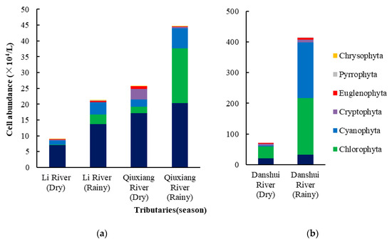 Cell abundance and phyla percentage of the phytoplankton community in three tributaries in the dry and rainy season. The cell abundance shown in the figure is the average of five samples. (a) lower cell abundance; (b) higher cell abundance.