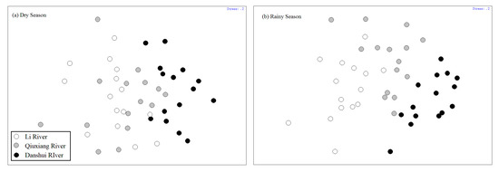 MDS analysis revealed that in the dry season, phytoplankton communities in the Danshui River were rather special, but those from the Li River and the Qiuxiang River were similar (Figure 3a). On the other hand, in the rainy season, it could be clearly seen that all phytoplankton of three tributaries were not similar (Figure 3b). The stress values of the two MDS plots were the same (0.2), which is considered to adequately represent similarity or dissimilarity between the samples in MDS plots. These differences were confirmed by one-way ANOSIM analyses, which showed that, for the phytoplankton cell abundance, the data for the three tributaries were significantly different in rainy season (p < 0.01 for all comparisons) (Table 4). In dry season, the observed differences between the Li River and the Qiuxiang River were not significant (p > 0.01), but the other two comparisons were significantly different (p < 0.01).