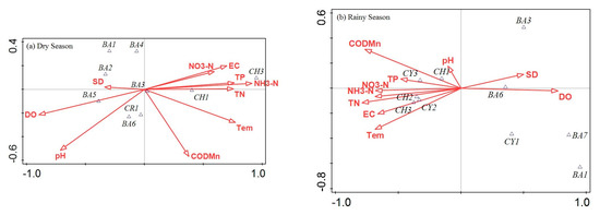 In this study, CCA was conducted between the 14 dominant phytoplankton taxa (Table 3) and 10 environmental factors. The statistical relationships between cell abundance of phytoplankton taxa and environment in three tributaries are shown in Figure 4 and Table 5. All the canonical axes significantly accounted for 51.2% (pseudo-F = 1.4, p < 0.05) of the phytoplankton cell abundance in the dry season and 46% (pseudo-F = 2.3, p < 0.01) in the rainy season. The first axis significantly explained 23.65% (pseudo-F = 4.0, p < 0.01) of the variation in the dry season and 25.42% (pseudo-F = 9.2, p < 0.01) in the rainy season, which was correlated with DO, SD, TN, NH3-N, NO3-N and TP. It was indicated that the first axis consistently displayed a gradient of nutrition. The second axis explained 8.35% (pseudo-F = 1.6, p > 0.05) of the variation in the dry season and 9.38% in the rainy season (pseudo-F = 3.9, p < 0.05), which was correlated with CODMn and pH. It was indicated that the second axis to some extent may characterized the pH and organic pollution.
