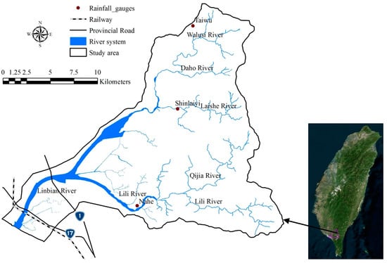 The study area was Linbian River Basin, located in the Southern part of Taiwan. It has a surface area of 336.3 km2 and an approximately 41.3 km long mainstream. The mainstream has an average slope of 1/88 and an average annual precipitation of approximately 2115 mm. Linbian River, whose map is shown in Figure 1, is one of the major rivers in Pingtung County.