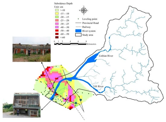 Linbian River Basin is regarded as an area with serious land subsidence (photos in Figure 3). Data were accumulated to quantify the land subsidence of previous years; estimates were calculated based on the land subsidence data collected at the land subsidence inspection points, set up by the Water Resources Agency, Ministry of Economic Planning and Agriculture (MOEA), in the Linbian River catchment area and in nearby areas. The amount of land subsidence accumulated for each inspection point was used together with GIS to construct the accumulated land subsidence numerical diagram shown in Figure 3.