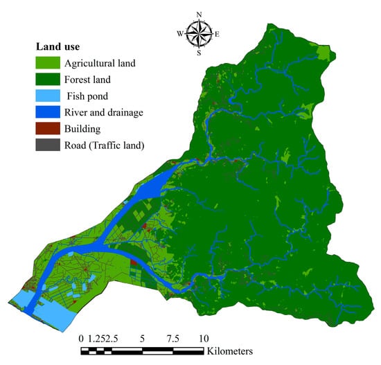 - Vulnerability score indexThe study area covers a wide range of land uses (Figure 4), such as buildings, agricultural land, forest land, and water resources (rivers and drainage); the flooding zone of the study area constitutes low-altitude coastal plains, and the coastal area is mainly used for the construction of populated buildings and agricultural land. Agricultural land includes rice farms, rain-fed crop farms, fruit farms, and fish farms. Table 2 shows the monetary value of each land use according to the investigation conducted by the Sixth River Bureau of the Water Resources Agency []. The monetary value of output for various land use per unit area and the consumer price index [] of Taiwan were used to compute the monetary values presented in Table 2. According to the table, construction land or buildings have the highest monetary values and fishing farms have the highest monetary values among other agricultural activities. Land uses influence not only monetary values, but also the damage induced by disasters, even multiple floods have the same inundation depth. Hence, classification of the investigated area is based on the different land uses and vulnerability score indices, as determined by the monetary values of these land uses. The agricultural land of the investigated area in this study is mostly occupied by fish farms, at which high-value species, such as grouper and shrimp, particularly the Epinephelus lanceolatus (common name: Giant grouper, Brindle bass, and Queensland grouper) are cultivated. For this reason, the vulnerability index of fish farming was separated from that of normal agricultural land, and was assigned according to the monetary values shown in Table 3.