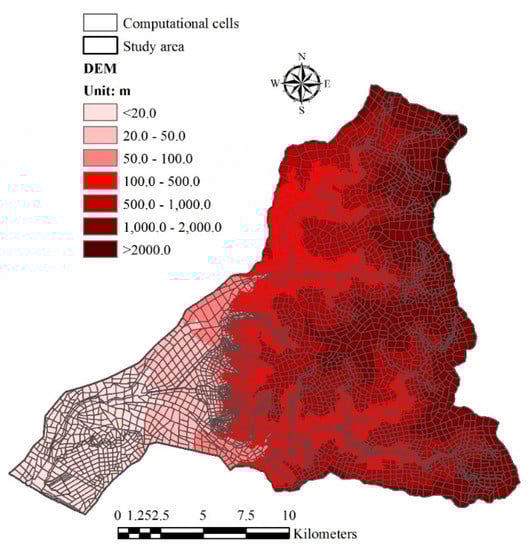 The digital elevation model (DEM) forms the basis of the automatic partitioning of the sub-catchment area. The adopted DEM (Figure 5) had a spatial resolution of 5 m × 5 m in a regular cell. River width and cells for the automatically partitioned catchment area were assigned based on the recent river measurement data provided by the Linbian River Bureau. To aid in catchment partitioning, the DEM was overlaid with additional maps, such as digitalized soil, land use, and road system maps. Extremely small or narrow cells were combined, and large cells were divided into appropriate cells. Finally, 4290 cells were defined; they are shown in Figure 5. Attributes of each cell served as input to the PDI model.