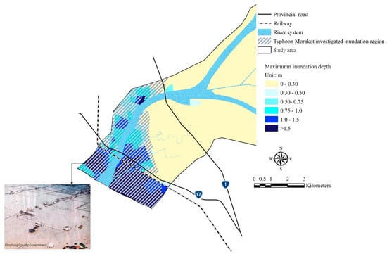 The investigated and simulated inundation areas for Typhoon Morakot are shown in Figure 6. The maximum possible inundation depth and inundation area simulated by the PDI model agreed well with the inundation determined on-site.