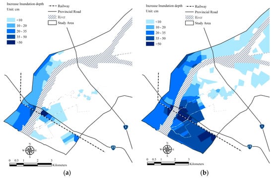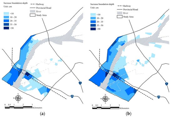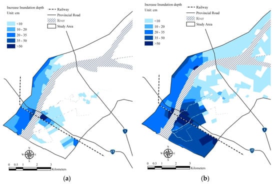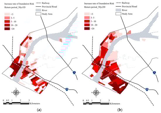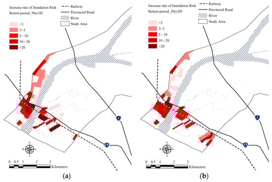 (a) Distribution map of inundation risk increase after land subsidence for a one-day storm under a 50-year return period; (b) Distribution map of inundation risk increase after l and subsidence for a two-day storm under a 50-year return period.