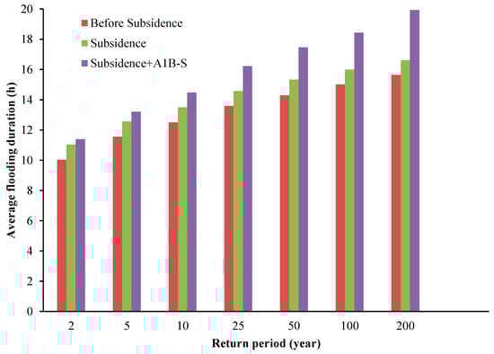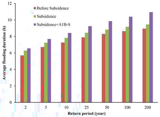 The average inundation duration with one- and two-day storms for each return period are shown in Figure 11 and Figure 12. These figures indicate that the average inundation duration after land subsidence for each return period tended to increase. Moreover, in the presence of land subsidence and the additional influence of climate change, the average inundation duration for each return period showed a significant increase, which was amplified as the return period increased. After land subsidence, the average inundation duration for each return period was 1.05–1.1 times greater than that before land subsidence. With the influence of both land subsidence and climate change, the average flooding duration for each return period was 1.13–1.27 times greater than that before land subsidence. Therefore, land subsidence tended to cause an increase in not only inundation depth but also in inundation duration.