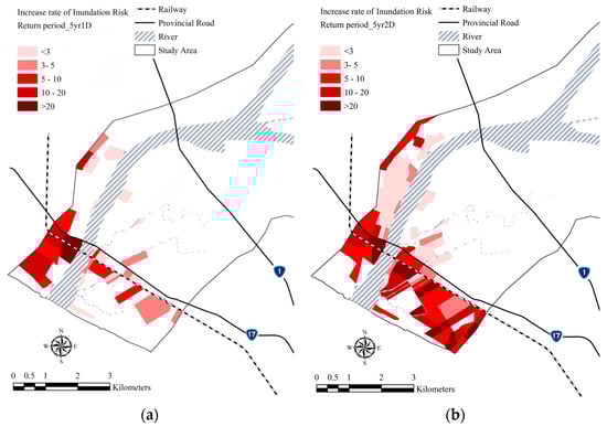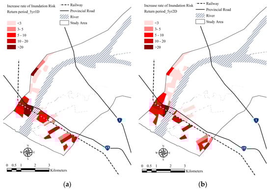 (a) Distribution map of inundation risk increase after land subsidence for a one-day storm under a 5-year return period; (b) Distribution map of inundation risk increase after land subsidence for a two-day storm under a 5-year return period.