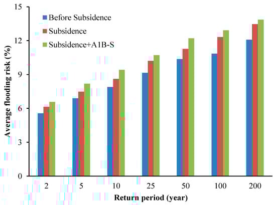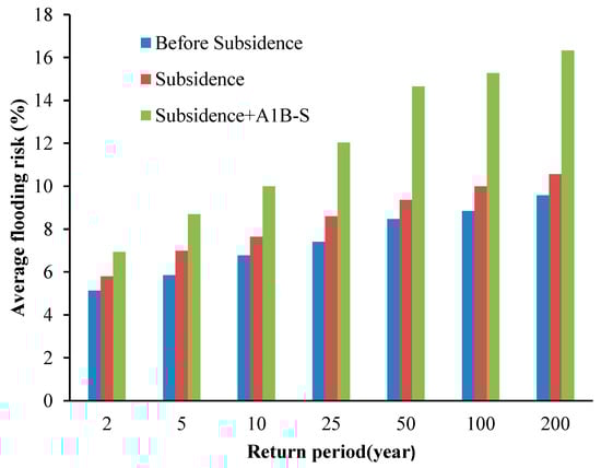 After land subsidence, the average inundation risk for each return period was 1.08–1.19 times greater than that before land subsidence. With the influence of both land subsidence and climate change, the average inundation risk for each return period was 1.14–1.73 times greater than that before land subsidence. Therefore, land subsidence combined with climate change seriously increases inundation risk, especially in any scenario with a two-day rainfall event.