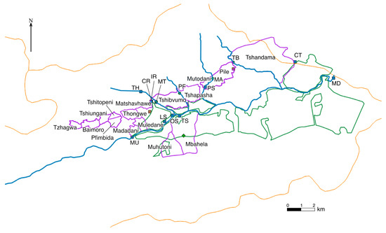 Aside from the municipal sources, many residents of three villages have access to a community installed and operated distribution system that delivers water from the adjacent ephemeral rivers throughout the community (CA, CB, and CC). These systems are constructed with 50 mm to 70 mm (5 to 7 × 10−2 m) high-density polyethylene pipes. Even these community-level schemes provide water on a schedule and sometimes require repair. Another common source of water for the community is springs. These shallow groundwater sources are common in the valley; however, there are communities that do not have a nearby spring. Some springs have had a pipe placed at the outlet to keep the spring open and facilitate filling containers. Researchers did not observe any constructions around the springs to properly isolate them from further contamination, and they are, therefore, not improved water sources. Pit latrines are common in every household throughout the region. Source (TS) is located near these communities while other springs (OS, LS) are located in agricultural areas. Boreholes provide deep groundwater supplies but require a pump. Such systems provide water as long as there is power for the pump and the well is deep enough to withstand seasonal variations. The two clinics in the study area surveyed each relied on a borehole for their water supply. Some residents also collected water directly from the river. The Mutale River is a perennial river; however, the ephemeral rivers, the Tshiombedi, Madade, Pfaleni, and Tshala Rivers, do not flow in the dry season all the way to the floor of the valley. The Tshala River has a diversion to a lined irrigation canal that always carries water, but there is very little flow that remains in the natural channel.