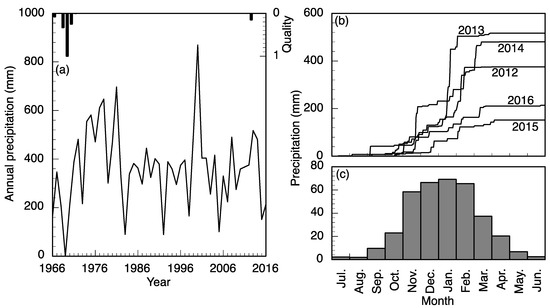 Precipitation trends in the study area. (a) Annual precipitation by hydrologic year. Data quality are presented on a scale of zero to unity where the quantity shown represents the proportion of missing or unreliable data in a year; (b) Cumulative precipitation for the last five complete years; (c) Average monthly precipitation calculated for years with greater than 90% reliable data (bottom right). All data are presented by the standard Southern hemisphere hydrologic year from July to June numbered with the ending year. Data are from the Nwanedzi Natural Reserve at the Luphephe Dam (17 km from the study area) and are available through the Republic of South Africa, Department of Water and Sanitation, Hydrologic Services (http://www.dwa.gov.za/Hydrology/).