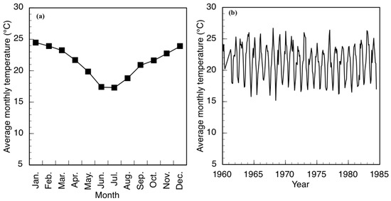 The mean monthly temperature in the region recorded at Punda Milia. (a) Mean monthly temperature based on the means from 1962–1984; (b) Mean monthly temperature record. Data are available from the National Oceanic and Aviation Administration (U.S.), National Climatic Data Center, Climate Data Online service (https://www.ncdc.noaa.gov/cdo-web/).