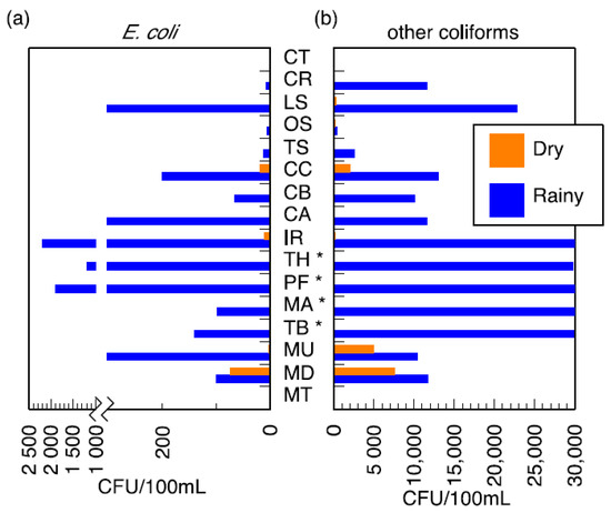 Membrane filtration results for (a) E. coli and (b) other coliforms. Data are presented for wet and dry seasons. The four ephemeral rivers (*) have no dry season data because they had no flow; all other sources have the results reported, some of which are zero or near-zero. South African National Standard (SANS 241:1-2015) set the limit of 0 CFU/100 mL for E. coli and 10 CFU/100 mL for total coliforms (CFU/10−4 m3). Ephemeral rivers that do not flow all the way into the valley are indicated (*) in the dry season.