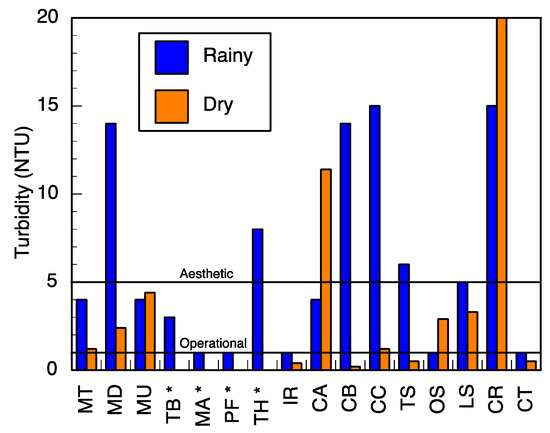 pH and conductivity values ranged between 5.5–7.3 and 24–405 μS/cm in the wet season and 5.8–8.7 and 8–402 μS/cm in the dry season (Table S1). Both pH and conductivity levels were within the recommended limits of the World Health Organization (WHO) for drinking water. The microbiological results and turbidity of the sources tested are presented in Figure 4 and Figure 5, and Table S2, respectively. Microbiological data show contamination with E. coli, a fecal coliform that is potentially pathogenic, and other coliform bacteria.