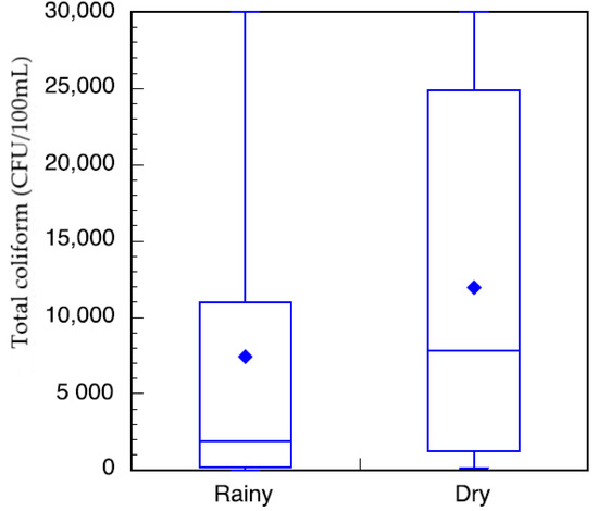 Box-and-whisker plot of total coliform measurements of stored, untreated water in study households in the wet (n = 95) and dry (n = 103) seasons. The box-and-whisker plot indicates the mean (diamond), first, second, and third quartiles (box), and minimum and maximum (whiskers).